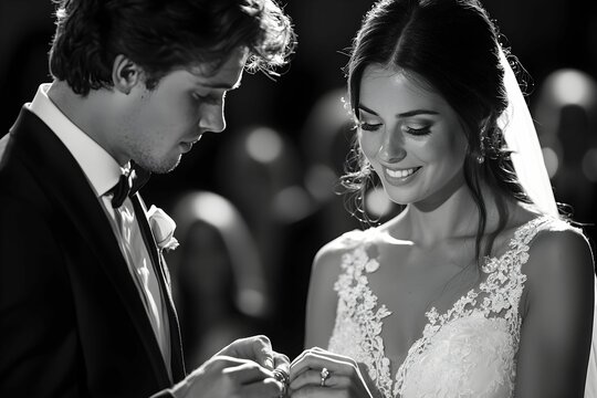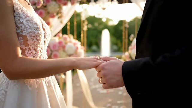 Wedding photography, close-up of hands exchanging wedding rings, soft romantic lighting