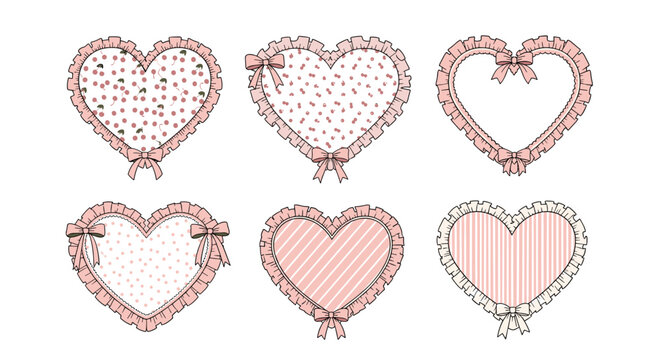 Collection of decorative heart shaped frames with pink ruffles and bows featuring patterns like polka dots stripes and cherry blossoms.