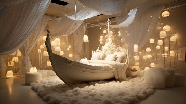 valentine theme concept. A luxurious bedroom decorated with a heart-shaped canopy over the bed, scattered petals, and glowing candles, Valentine theme, intimate heart-shaped love