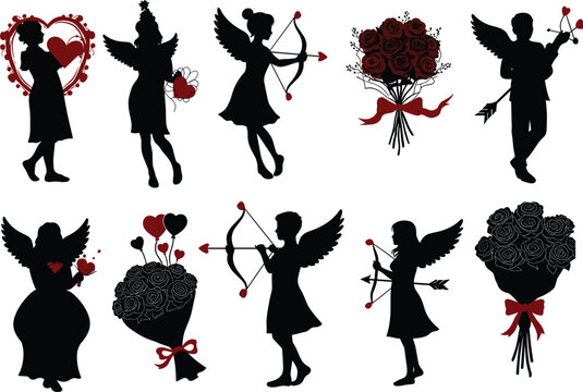 Valentine silhouette illustration, love theme vector, romantic clipart design, heart bouquet, Cupid character, black and red graphic, holiday art