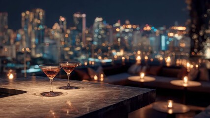 Romantic rooftop cocktails with city skyline at night