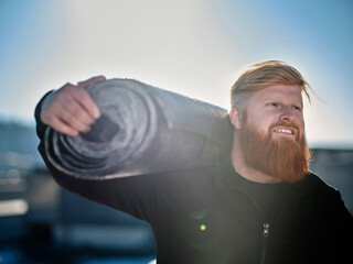 Smiling roofer with roofing felt roll on sunny day
