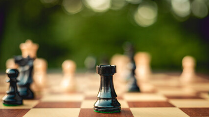 The rook in highlight. Pieces of chess game, image with shallow depth of field.