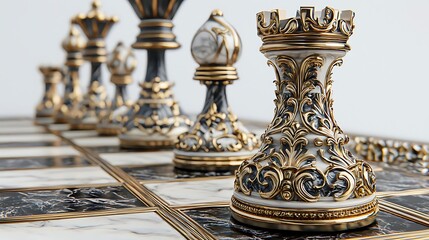A luxury chess rook in gold and white sits proudly on the board, a statement of opulence.