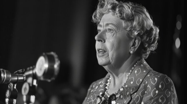 Black and white photo of Eleanor Roosevelt giving a speech