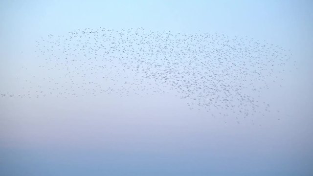 Starling murmuration. A large flock of starlings (Sturnus vulgaris) fly at sunset just before entering the roosting site in the Netherlands. They make big clouds to protect against bords of prey.