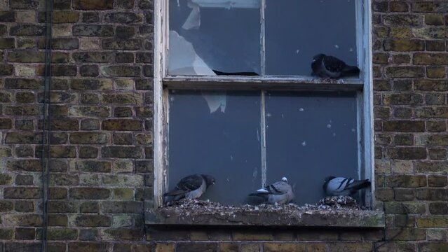 Pigeons roosting on window of derelict building
