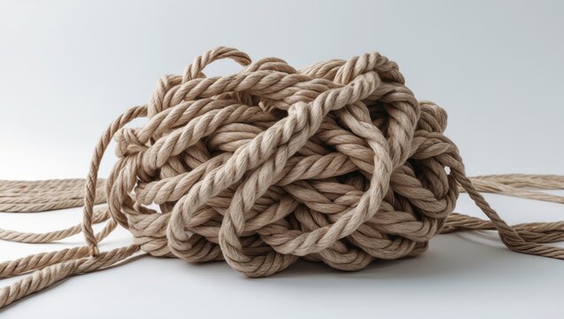 Tangled, untangled concept with two rope balls on white background. Simple start turns complex, confusing. One part organized, another messy. Difficult choice between simplicity and chaos.
