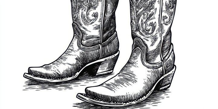 Cowboy Boot Illustration. Woodcut Style Roper Boots for Rodeo Cowboy and Cowgirl Collection