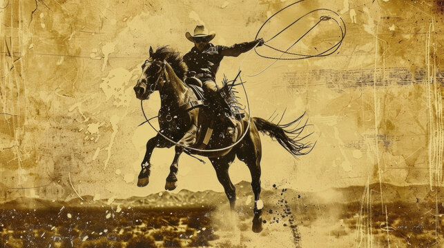 A faded poster advertising a wild west roper in midair rope circling a bucking horse against a rustic background. .