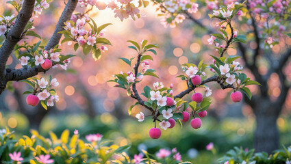 A picturesque view of ornamental apple trees displaying their vibrant red fruits and spring blossoms.