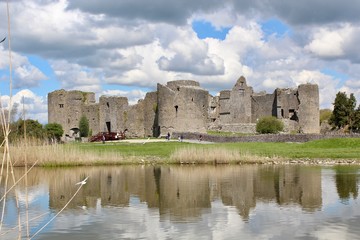 Beautiful lake in front of the old Roscommon Castle in Ireland under a cloudy sky