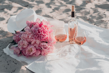 French style romantic summer picnic setting. Flat-lay of glasses of rose wine with ice, fresh strawberries, croissants, brie cheese, straw hat, sunglasses, peony flowers. Outdoor gathering concept