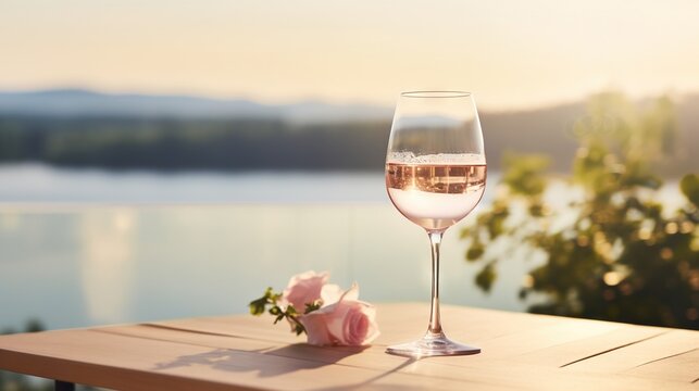 Two glasses of white wine on a wooden restaurant table  with candles and red rose petals, romantic valentines day dinner date love and passion