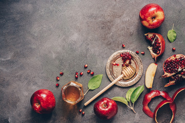 Rosh Hashanah. Pomegranate, apples and honey traditional products for celebration on rustic grey background. Jewish Autumn Rosh Hashana celebration. Jewish holiday Rosh Hashana design. Selective focus