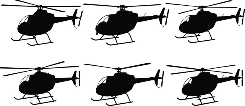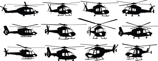 Helicopter silhouette vector set, military aircraft icons, rotorcraft shapes, aviation design elements, black helicopter profiles, isolated transport helicopter illustrations