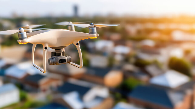 Futuristic courier drone carrying glowing package over suburban neighborhood sunset with warm