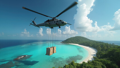 Heavy lift helicopter transports cargo crates suspended by cables over pristine tropical island coastline with turquoise water, white sand beaches. Verdant green jungle hills form background under