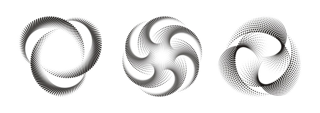 Vortex forms, abstract halftone dot pattern series, a geometric spiral stylish design elements, well-suited for framing, circular icons, signage, and symbols.