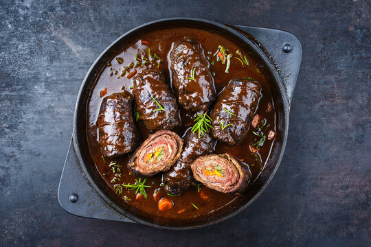 Traditional slow cooked German wagyu beef roulades with vegetable and bacon served in spicy gravy sauce as top view in a design pot with copy space
