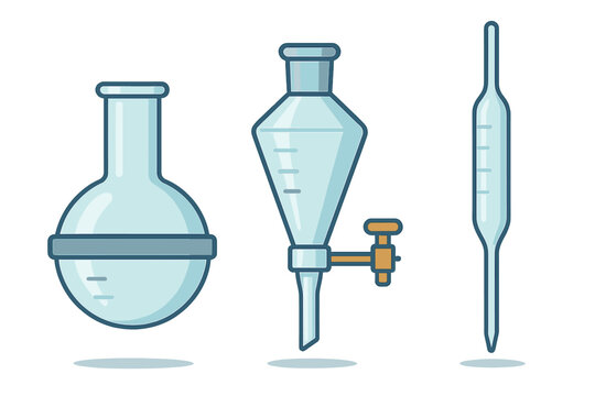 Set of laboratory glassware including round bottom flask, separatory funnel, and pipette