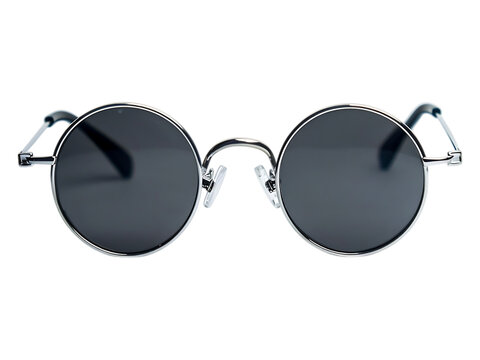 Street style oval sunglasses with thin silver metal frame, black matte lens, isolated on white background, front view.