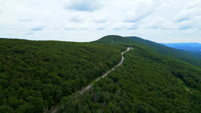 Panorama drone view over Route 2 Mohawk Trail overlook with green forest landscape, Berkshire, Massachusetts, USA