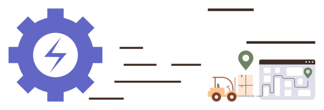 Logistics, supply chain, delivery tracking, route optimization, transportation, shipping. Gear icon with lightning bolt, forklift with boxes and delivery route map. Logistics and supply chain