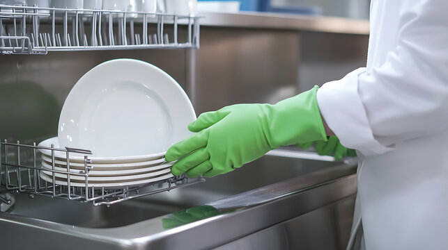Gloved hands carefully place clean white plates into a stainless steel dishwasher rack, ready for use in a pristine kitchen environment.