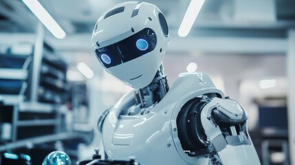A futuristic robotic assistant performing routine maintenance in a clean, high-tech industrial facility, advanced and organized environment with a focus on industrial automation