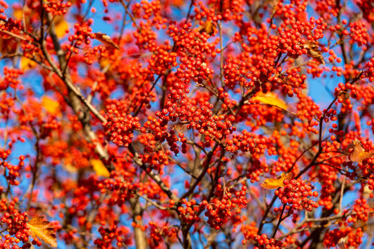 The wonderful colors of late summer. A close-up of intensely red rowan berries against a clear blue sky.