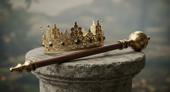 Golden royal crown shining under dramatic light with dark cloudy background