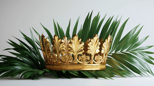 Ornate golden crown resting upon vibrant green palm leaves against a neutral background. Regal and tropical.