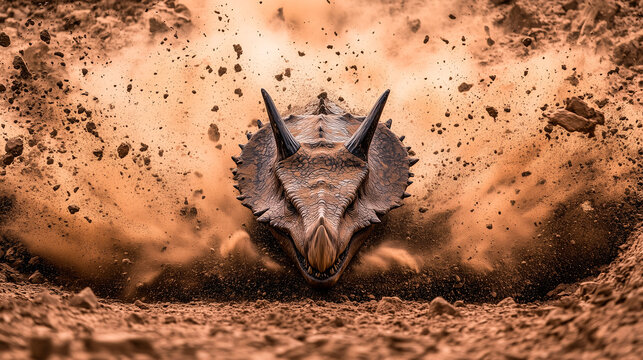Dinosaurio Triceratops atacando a través del polvo y tierra