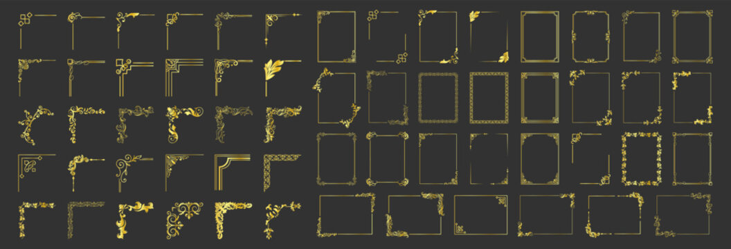 Decorative gold corner frames set. Vintage ornamental borders and elegant design elements for wedding or invitation. Vector collection