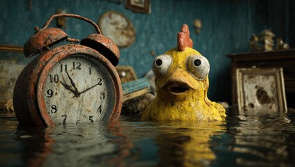 A chilling close-up of an undead being with decaying skin, visible wounds, and a vacant stare, clutching a vividly colored rubber chicken.