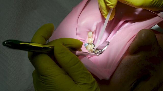 Dentist and assistant drilling tooth in dental clinic. Close-up shot of unrecognizable female patient wearing rubber dam and getting dental treatment. High quality 4k footage