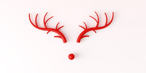 Abstract minimal Christmas reindeer face made with antlers and a bauble decoration nose. 3D Rendering
