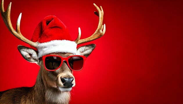 Cool Reindeer wearing sunglasses and Santa hat, Deer of Left Side of image, copy space to the right
