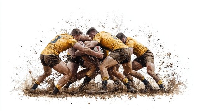 Dynamic Rugby Scrum in Watercolor: Players Competing for Dominance on Muddy Field with Expressive Brush Strokes