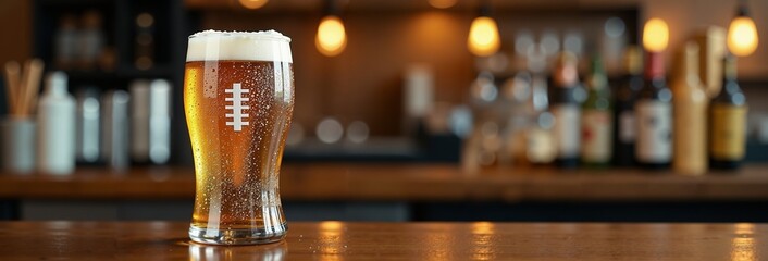 Beer glass with football laces design in bar setting. Concept of sports bar experience