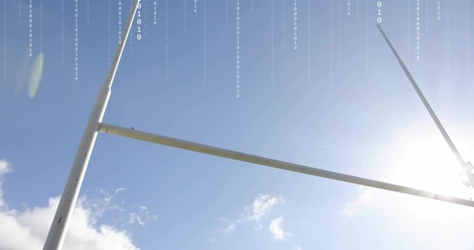 At fourth second binary code raining over rugby goalposts as ball falling balancing on crossbar