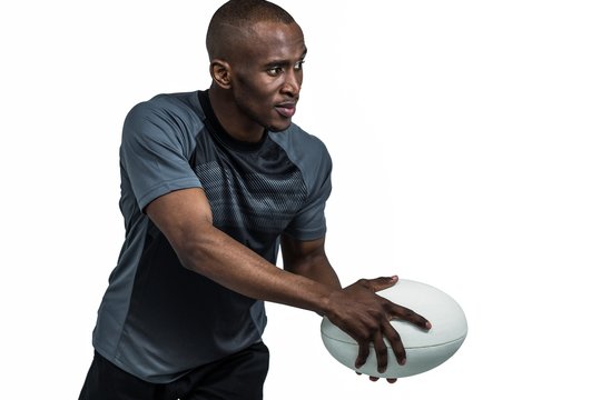Rugby player holding ball ready for action