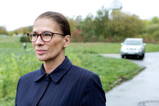 Smiling businesswoman with eyeglasses next to field