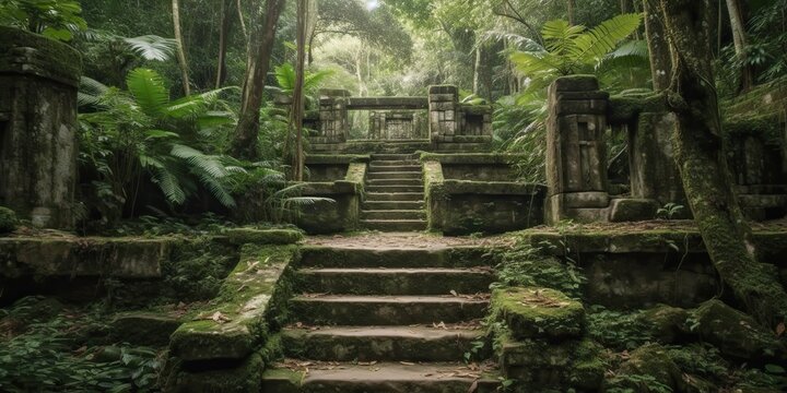 AI Generated. AI Generative. Ancient old jungle forest building ruin history civilisation outdoor landscape. Adventure explore new lands