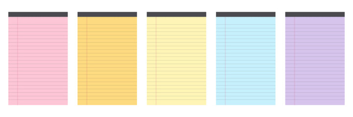 Colorful College Narrow Ruled Legal Pads. Lined paper with margin. Blank stationary for notes and writing. Isolated sheet for education document. Vector