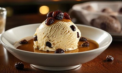 Creamy rum raisin ice cream gourmet scoop with plump raisins and drizzle