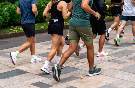 Urban running club community in colorful activewear jogging together across pedestrian areas, bridges, and parks. Anonymous group of runners in a vibrant city setting