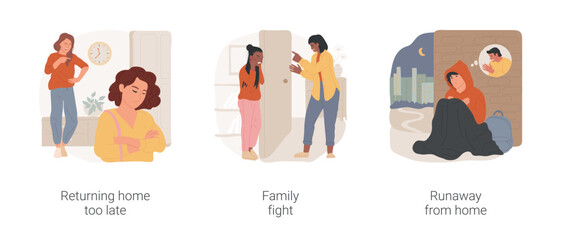Conflicts with parents isolated cartoon vector illustration set. Teenager returning home too late, angry parents, family fight, teen yelling and closing door, runaway from home vector cartoon.