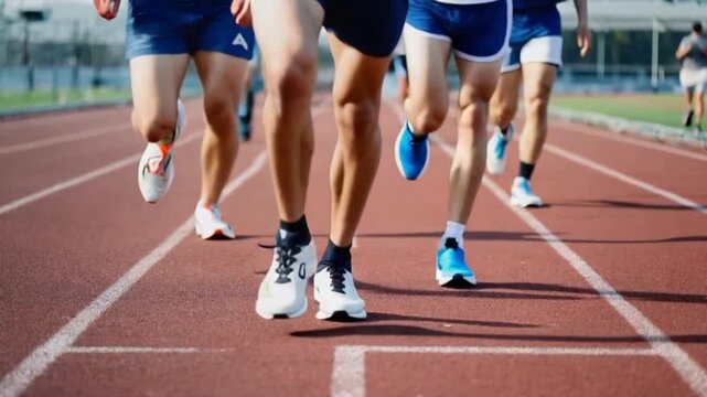 athletic runners track race legs mid stride running shoes competition video